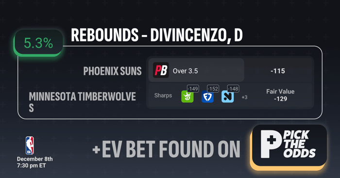 This is a pure market +EV: sharp books are laying action at -149 / -152 / -148, which the model aggregates into a fair value around -129, while the retail market is offering -115 — that gap between the sharp-implied price and the available number is where the edge lives. In plain terms the sharps are valuing the prop substantially worse for the book than the public price implies, so buying it at -115 means you’re paying less than what the sharp consensus says it’s actually worth; that pricing discrepancy is what produces the ~5.3% expected value shown on the card. No matchup talk needed — just a measurable, repeatable edge created by mispricing between sharp consensus and the available market.