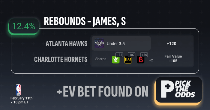 This play qualifies as a strong +EV bet because the market is offering a significant price discrepancy versus sharp consensus. Sion James Under 3.5 Rebounds is available at +120, while multiple sharp sportsbooks are pricing the same outcome at -132, -130, and -107, indicating heavy professional alignment on the under. Based on these sharp lines, the fair value is approximately -105, meaning +120 represents a massive edge relative to true probability. That gap translates to an expected value of +12.4%, which is well above the threshold most bettors target for long-term profitability. When you’re consistently getting plus money on outcomes that sharp books price as favorites, you’re betting into inefficiency — and this line is a textbook example of a mispriced market offering clear +EV.