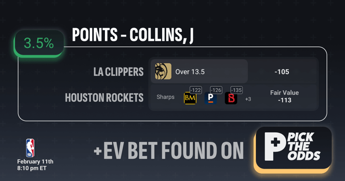 John Collins Over 13.5 points grades out as a +EV position due to a clear pricing edge versus sharp consensus. The market is currently offering -105, while respected sharp sportsbooks are pricing the same over at -122, -126, and as high as -135, signaling strong professional agreement on the over being the correct side. Using those sharp lines, the fair value projects to -113, meaning bettors are getting a discount of roughly 8 cents compared to true odds. That discrepancy results in an expected value of +3.5%, which is meaningful when scaled over volume. When you can lay near even money on a prop that sharp books consistently price as a stronger favorite, you’re capitalizing on inefficiency — making this Collins over a disciplined, long-term +EV bet.