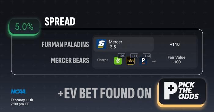 Mercer -3.5 qualifies as a +EV spread bet due to a clear pricing mismatch against sharp market consensus. The line is currently available at +110, while respected sharp sportsbooks are pricing Mercer at -105, -111, and -113, signaling professional money heavily favoring Mercer to cover this number. Based on those sharp prices, the fair value projects to around -100, making +110 a sizable edge relative to true probability. That discrepancy creates an expected value of approximately +5.0%, which is well above breakeven and attractive from a long-term betting standpoint. When you’re able to take plus money on a side that sharp books consistently price as a favorite, you’re exploiting market inefficiency — making Mercer -3.5 a disciplined, data-backed +EV wager.