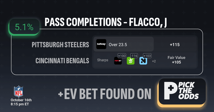This bet is +EV because Betway is offering Over 23.5 completions for Joe Flacco at +115, which is significantly higher than the market consensus. Other sharp sportsbooks have the same line priced closer to +100 to -116, implying fair odds around +105. That creates a 5.1% edge, meaning the payout from Betway exceeds the true probability implied by sharper markets. Essentially, the market suggests Flacco has a better chance of hitting this over than Betway’s odds reflect, so taking +115 provides long-term value based on the discrepancy in pricing.