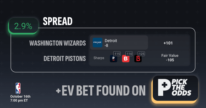 Detroit is being offered at -8 with +101 juice, while sharp books are pricing the same spread around -110 to -125 and our aggregated fair number is about -105. In plain terms, the market implies Detroit should cover more often than +101 suggests — the consensus probability translates to a slightly better than even chance to cover, so taking the +101 price is buying that cover at a discount relative to fair value. That gap between what sharp books signal and what this shop is paying equals roughly a 2.9% expected value — small but positive, meaning repeated bets at this price should net a profit over time.