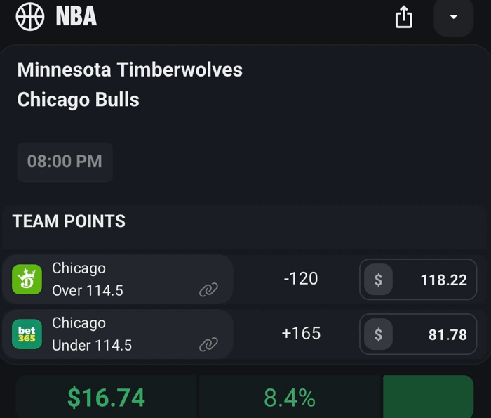 Let's say you take Chicago Over 114.5 Team Points on DraftKings at -120 odds for $118.22 If this side hits you win $216.