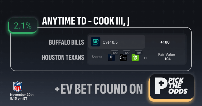 This is also a +EV bet because you’re getting +100 on James Cook Anytime TD while sharp books like Pinnacle, Circa, and DraftKings are pricing the same prop between –120 and –105, with a Fair Value of –104. Those sharper odds imply Cook has a 52–55% true probability to score, while +100 only requires a 50% break-even rate, meaning the market believes Cook is more likely to find the end zone than the odds you're being offered. When the implied probability is higher than the break-even probability, you’re locking in a mathematical advantage, making this a legitimate positive expected value play.