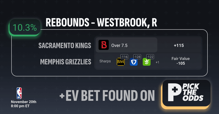 This is also a +EV bet because you’re getting Over 7.5 rebounds on Westbrook at +115 while the sharps are heavily shaded on the opposite side, pricing this closer to the -116 to -128 range, which signals where sharper money believes the true probability lies. The fair value of -105 further supports that the true line should be shorter than the offered price, meaning you’re capturing meaningful line value. With an EV of +10.3%, the sportsbook is effectively overpaying for this outcome relative to its true odds, giving you a long-term edge by taking advantage of mispriced market numbers.