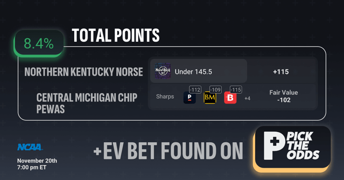Northern Kentucky vs Central Michigan under 145.5 qualifies as a +EV play because you’re taking +115 on a total that sharp books are consistently pricing shorter, with respected markets sitting between -109 and -115, signalling that smarter money is leaning toward a lower-scoring outcome. The model’s fair value of -102 further reinforces that the true line should be closer to even money or worse, not plus odds, meaning you’re being paid above the expected price. With an EV of +8.4%, this under offers a clear mathematical edge by capitalising on a number that remains inflated relative to sharp consensus and true probability.