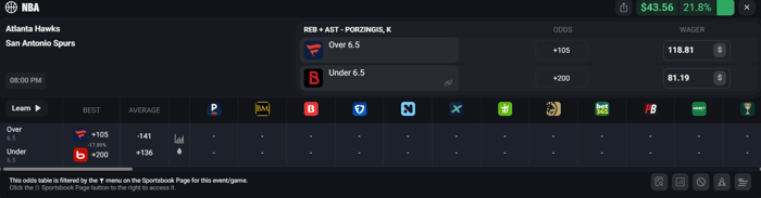 Bet 5: Porzingis Over 6.5 / Under 6.5 Rebounds + Assists