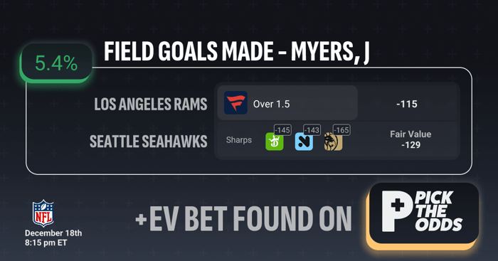 Jason Myers over 1.5 field goals is a clear +EV play based on market alignment and pricing inefficiencies. The best available line sits at -115, while multiple sharp sportsbooks are pricing this same prop significantly higher at -145, -143, and -165, signaling strong respected-money support on the over. With a Fair Value of -129, the current -115 number is notably mispriced, creating a +5.4% expected value edge. When the sharp side of the market is laying much steeper juice and you’re able to grab a discounted price below fair value, it indicates long-term profitability — making this a strong +EV betting opportunity.