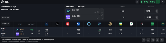 Let's say you take Clingan Under 10.5 Rebounds on Hard Rock at +115 odds for $101.83. If this side hits you win $218.