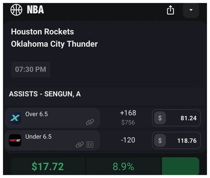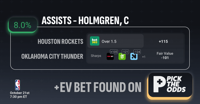 This is also a +EV bet because Bet365 is offering Holmgren’s over 1.5 assists at +115, while sharp books have this line priced closer to -121 to -124, implying fair value around -101. That pricing gap creates an 8% expected edge — meaning the market consensus suggests this line should be juiced toward the over. Holmgren’s consistent playmaking (2.0 assists per game last year) and full workload in the opener against a weak Houston defense make the over not just statistically reasonable, but a profitable value play compared to sharper market odds.