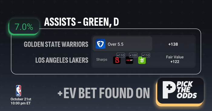 This is a +EV bet because FanDuel is offering Draymond Green’s over 5.5 assists at +138, while sharp books have this line priced around +110 with a fair value of +122, creating roughly a 7% expected edge. The market discrepancy suggests that FanDuel is hanging an inflated number compared to sharper consensus odds. Green averaged 5.6 assists last season and remains the primary facilitator in Golden State’s offense. With LeBron James sidelined, the Lakers’ defensive rotations could weaken, increasing Green’s chances to rack up assists and making this plus-money line a strong value position.