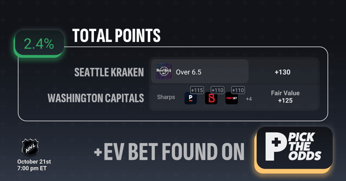 This is a +EV bet because Hard Rock is offering the over 6.5 total points at +130, while sharper books are sitting around +110 with a fair value of +125, giving this play a 2.4% expected edge. The line discrepancy shows the market is slightly undervaluing the over. Both the Kraken and Capitals have been involved in high-scoring games early in the season, with Seattle allowing 23 points and Washington giving up 20. With two struggling defenses and multiple offensive threats on both sides, the data supports value on the over at this inflated price.
