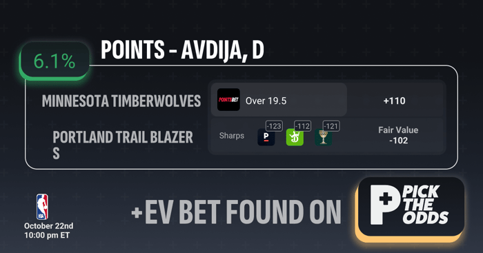 This is a strong +EV play with Deni Avdija Over 19.5 points (+110) offering clear market value. Sharper books have this same prop priced between -112 and -123, indicating a fair value of -102 — creating a 6.1% expected edge on PointsBet. Anytime you can grab a prop at plus money where sharp markets are laying juice, it’s a sign of mispriced odds. With Avdija projected for an increased offensive role due to roster changes, the volume supports the number, but the real angle here is the line discrepancy — you’re getting positive closing line value (CLV) on a prop that’s likely to move toward the -110 range before tip-off.