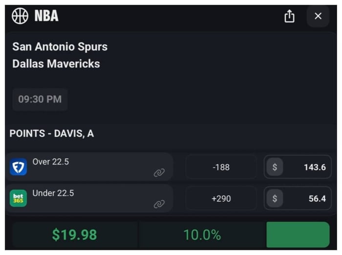 Let's say you take Davis Under 22.5 Points on Bet365 at +290 odds for $56.40 If this side hits you win $219
