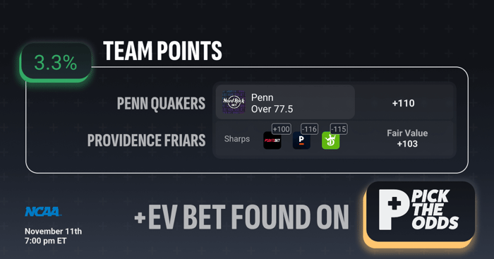 This Penn Quakers Over 77.5 at +110 is a clear +EV opportunity based on market discrepancies. The fair value line is +103, meaning the true implied odds suggest this bet should be priced shorter than what Hard Rock is offering. With sharps like PointsBet (-100), Pinnacle (-116), and DraftKings (-115) all pricing the same play lower, it indicates respected money is backing a higher expectation for Penn’s scoring output. That creates a 3.3% edge for bettors taking the +110 number — an efficiency gap worth exploiting. Anytime sharp books are aligned on a tighter price while a retail book lags behind, the value lies in the inefficiency, and this Penn team’s recent scoring consistency (clearing this number in both games) only reinforces the positive expected value.