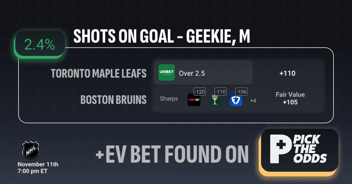 This Morgan Geekie Over 2.5 Shots on Goal (+110) line at Unibet presents a textbook +EV betting opportunity driven by mispriced odds. The fair value sits at +105, creating a 2.4% edge over the market. Sharp books like PointsBet (-120), Bet365 (-110), and FanDuel (-106) all have this same prop priced shorter, signaling that respected money and sharper models project a higher probability of Geekie surpassing 2.5 shots. When multiple sharp operators converge on tighter odds while a retail book offers a softer +110, that discrepancy is what creates the positive expected value. Backing this number means capitalizing on both market inefficiency and Geekie’s recent shot volume — 11 shots in his last 3 games — which aligns perfectly with the value edge indicated by the sharper markets.