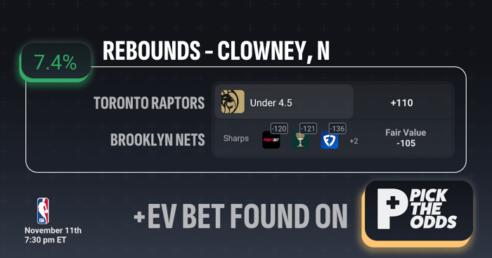 This Noah Clowney Under 4.5 Rebounds (+110) play offers a strong 7.4% expected value (EV) edge, making it one of the sharper spots on the board. The fair value sits at -105, while sharp books like PointsBet (-120), Bet365 (-121), and FanDuel (-136) are all pricing the same prop significantly lower. That discrepancy indicates that respected markets project a much higher probability of Clowney staying under this number than Unibet’s inflated +110 line suggests. With the Nets averaging just 38 rebounds per game — among the lowest in the league — and Clowney going under this total in three straight games, the data supports the under while the market inefficiency amplifies the betting value. When sharp books align and a retail line drifts higher, it’s a textbook +EV opportunity.