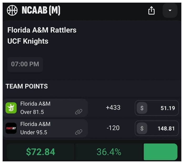 Let's say you take Florida A&M Over 81.5 Team Points on DraftKings at +433 odds for $51.19 If this side hits you win $272.