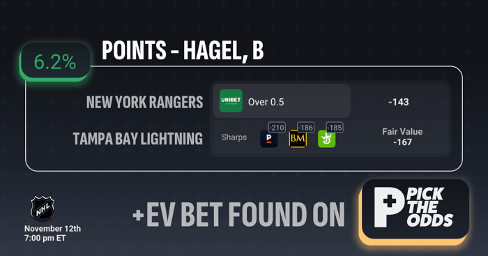 This +EV bet on Brandon Hagel to record over 0.5 points offers a 6.2% expected value, meaning the odds from Unibet (-143) are significantly better than the market consensus. Sharp books like Pinnacle (-210), BetMGM (-186), and DraftKings (-185) imply a much higher probability of Hagel recording a point, giving this line a fair value of -167. That discrepancy between Unibet’s price and the sharper market creates a profitable edge over time — you’re effectively getting a player prop at a discount compared to the most accurate odds in the market.