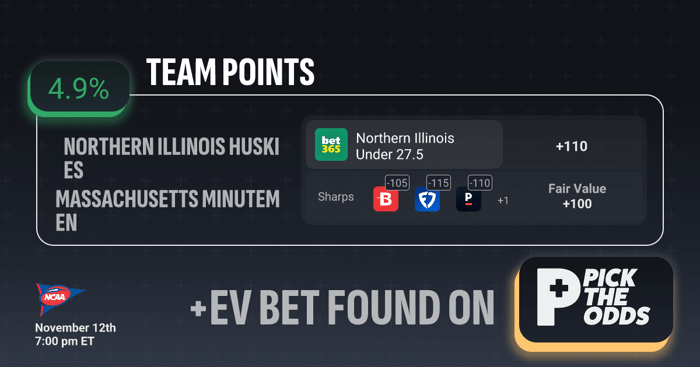 This Northern Illinois Under 27.5 team total is a strong +EV play with 4.9% expected value, thanks to the generous +110 line at Bet365. Sharp sportsbooks like BetOnline (-105), FanDuel (-115), and Pinnacle (-110) all have this line priced much shorter, suggesting a true fair value of +100. That gap indicates Bet365 is offering better odds than the most efficient markets, giving bettors a clear statistical edge. When sharp books align on a number and a recreational book drifts higher, it’s often a sign of exploitable value — exactly what this +EV edge represents.