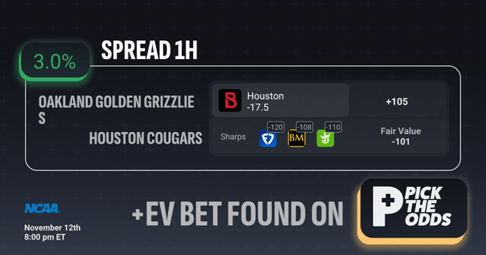 This Houston -17.5 first-half spread presents a solid 3.0% expected value with Bovada offering +105, a clear outlier compared to sharper markets. Books like FanDuel (-120), BookMaker (-108), and DraftKings (-110) all price this line much shorter, pointing to a fair value of -101. That means BetRivers is essentially overpaying for the same position, giving bettors a profitable long-term edge. When sharp books agree on a number and a recreational book drifts this far, it’s a textbook case of line value — a true +EV opportunity backed by market inefficiency.
