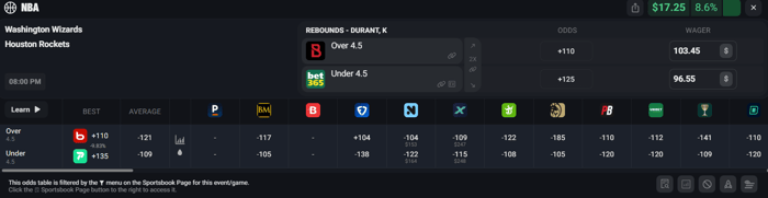 Let's say you take Kevin Durant Under 4.5 Rebounds on Bet365 at +125 odds for $96.55. If this side hits you win $217.