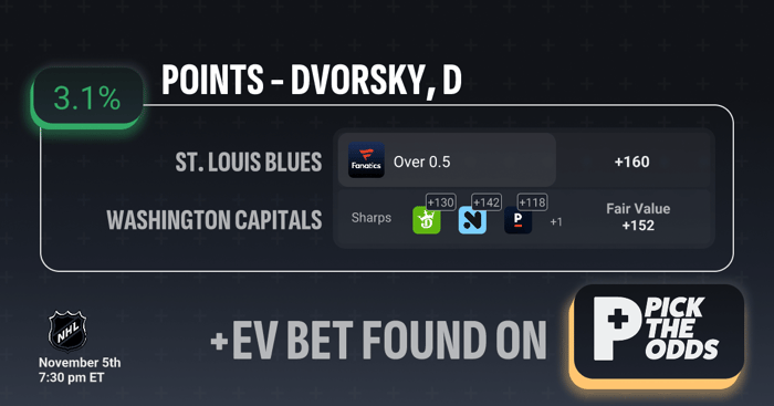 This Dalibor Dvorsky Over 0.5 Points (+160) line on Fanatics presents a clear +EV opportunity based on market discrepancies. Sharp sportsbooks such as DraftKings (+130), NoVig (+142), and Pinnacle (+118) all have this prop priced shorter, implying a fair value around +152. That creates a 3.1% expected value edge, meaning the probability of Dvorsky recording at least one point is slightly higher than Fanatics’ odds suggest. He’s also coming off a game where he found the back of the net, signaling growing confidence and offensive involvement. When the betting market undervalues a player trending upward and sharper books are tighter on the under, it’s a solid sign of positive market value — and this play fits that profile perfectly.