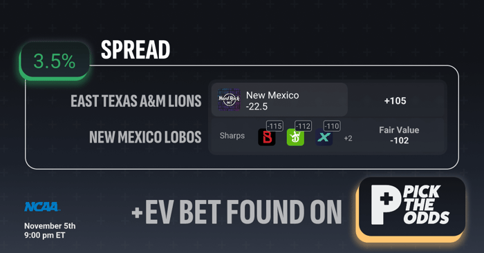 This New Mexico -22.5 (+105) line on Hard Rock stands out as a +EV opportunity with a 3.5% edge based on market comparison. Sharp books like BetOnline (-115), DraftKings (-112), and BetRivers (-110) all price the same spread significantly shorter, implying a fair value of -102. That pricing gap indicates you’re getting superior odds on a team projected to dominate. New Mexico’s recent track record backs it up — they were 16-1 at home last season and rank among the most efficient offenses in the Mountain West. Meanwhile, East Texas A&M is a major downgrade in competition, coming off a 5-win season with one of the lowest offensive efficiencies in the country. When sharp books are aligned on a number and one outlier offers plus money, it’s a clear signal of market value — making this a strong +EV play.