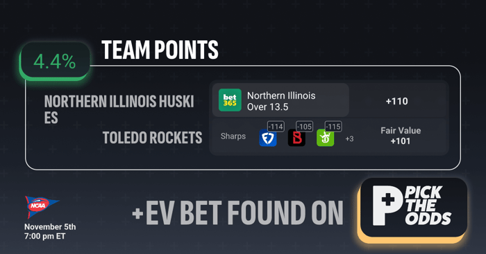 This Northern Illinois Over 13.5 Team Points (+110) line on Bet365 offers strong +EV value at 4.4%, backed by clear market discrepancies. Sharp books like FanDuel (-114), Bovada (-105), and DraftKings (-115) all have this same line priced shorter, indicating a fair value of +101. That means the implied probability at Bet365 is too low — giving bettors a mathematical edge. Northern Illinois has already cleared this number in three games this season, showing the offense is capable of producing even against tougher defenses. Meanwhile, Toledo’s defense has been inconsistent, allowing multiple teams to find success through the air in recent weeks. When the sharper books are all lined up on one side and an outlier offers plus money, it signals real positive expected value — making this a smart market-based play.