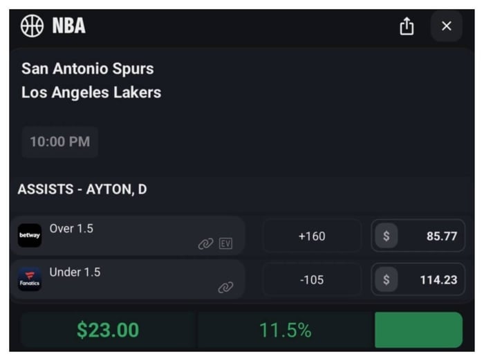 Let's say you take Under 1.5 Assists on Fanatics at -105 odds for $114.23 If this side hits you win $223.