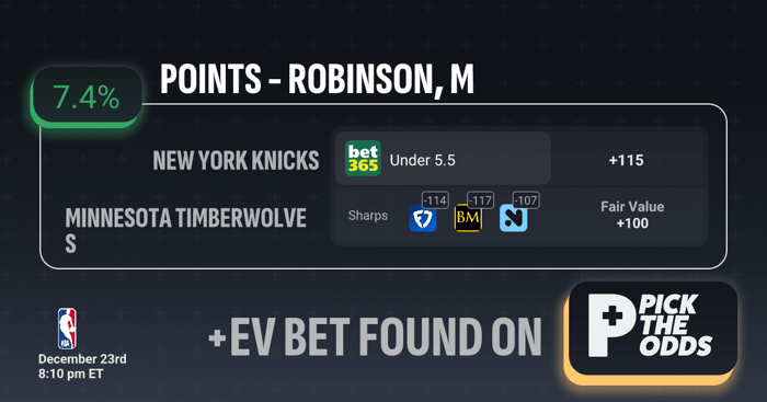 This spot grades as +EV because the offered price on Mitchell Robinson Under 5.5 points at +115 is meaningfully better than the broader market and the implied true price. Sharp books are dealing the same under closer to -114, -117, and -107, signaling respected money agrees with a lower-scoring expectation, while the calculated Fair Value is +100, meaning +115 gives you extra cushion beyond what the odds should be. That gap translates to an expected value of about +7.4%, which comes from consistently beating the sharp consensus rather than predicting outcomes—you're getting paid as if the under is less likely than the sharp market believes it is.