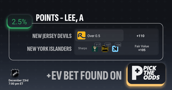 Anders Lee has shown he’s capable of producing on the scoresheet recently, making OVER .5 points an attractive prop play. The New York Islanders forward has accumulated 23 points so far this season, ranking among his team’s consistent offensive contributors with 9 goals and 14 assists to date in the 2025-26 campaign. Over his last five games, Lee has been noticeable with 7 points, including a multi-point effort highlighted by 4 points in a single game, proving he can find the back of the net or set up teammates when given opportunities. That recent stretch of production shows Lee isn’t just a bystander — he’s actively involved in the Islanders’ attack and getting into positions to score or assist. With his veteran savvy and offensive instincts, Lee’s sustained involvement gives bettors confidence that he’ll reach at least one point in the matchup, especially given how fruitful his recent form has been.From an odds-comparison standpoint (not a recommendation to wager), this qualifies as +EV because the Over 0.5 points at +110 is priced above both the sharp market and the calculated true line. Multiple sharp books are holding the same side at -117, -107, and -104, which implies a higher probability than what +110 suggests, showing respected money leans toward the over. The Fair Value is +105, so getting +110 means you’re beating the true price by a small but measurable margin, resulting in an expected value of about +2.5%. That edge comes purely from price inefficiency relative to sharp consensus, not from predicting performance.