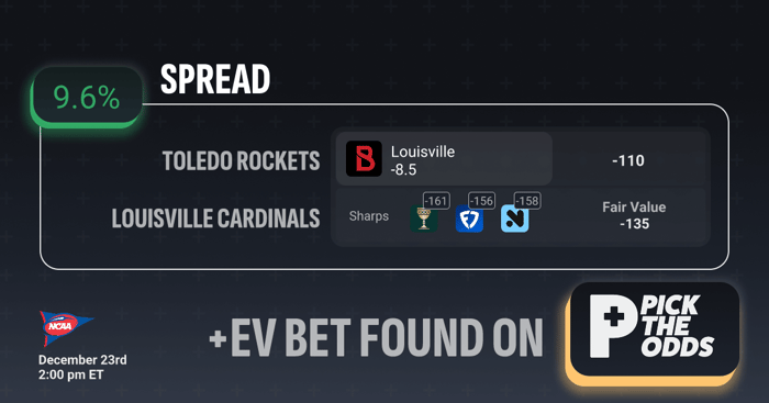 This shows positive expected value because the market is pricing Louisville -8.5 at -110 while sharper books are dealing the same spread much higher (around -161, -156, and -158), signaling strong sharp-side agreement on Louisville. When respected sportsbooks consistently post worse prices, it implies the true probability is higher than what -110 reflects. The calculated Fair Value of -135 suggests the line should be significantly more expensive, and getting -110 represents a meaningful edge versus that consensus price. That gap between the offered odds and fair value produces the +9.6% EV, indicating the bettor is being paid more than the true risk would justify based on sharper market information.