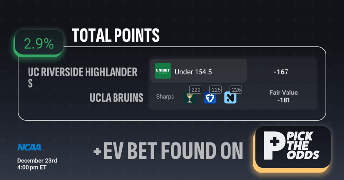 Under 154.5 is a solid +EV look at +2.9% EV, as we’re grabbing -167 when the fair value is closer to -181, giving us clear line value. Sharp money strongly backs this side as well, with multiple respected books pricing this total significantly lower in the -220 to -226 range, signaling professional agreement that the number is inflated. When you can align positive EV, sharp consensus, and better odds than true price, that’s exactly the profile you want to be targeting long term.