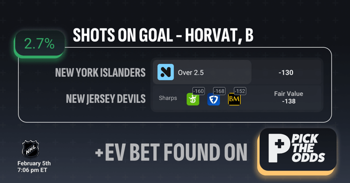 This qualifies as a +EV spot because Bo Horvat Over 2.5 shots on goal is available at -130, while the fair value is closer to -138, creating an implied edge of roughly 2.7% expected value. Sharp sportsbooks are already pricing this market significantly higher, with respected books showing -152, -160, and -168, signaling strong professional agreement on the over. Securing -130 when the sharper consensus implies a much higher true probability means you’re beating the market price, making this a value-driven wager based on odds disparity rather than narrative.