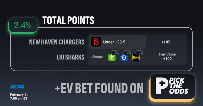 This Under 138.5 qualifies as a +EV bet because the market is offering a clear pricing edge compared to sharp consensus and fair value. While the playable line is available at +105, multiple sharp books are dealing the same total at -110 and -108, signaling respected money backing the under at worse prices. PickTheOdds’ fair value is +100, meaning the current +105 offers bettors an extra 5 cents of value, translating to a +2.4% expected value edge. When you’re able to grab plus money on a line that sharps are comfortable laying juice on, that pricing discrepancy is exactly what long-term profitable bettors look to exploit.