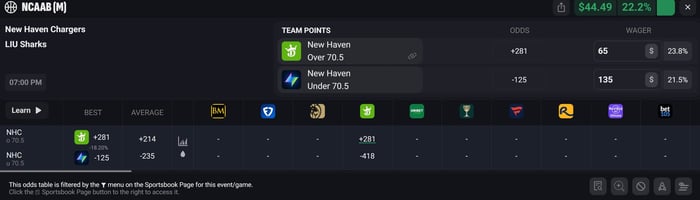 Let's say you take New Haven Over 70.5 on DraftKings at +281 odds for $65. If this side hits you win $244.
