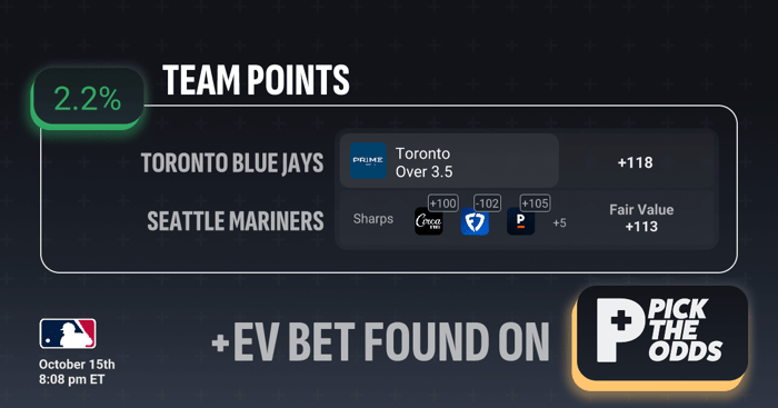 This Toronto Blue Jays Over 3.5 Team Points (+118) play shows a +2.2% expected value (+EV) because the current market price offers better odds than the consensus fair value of +113. That means the line available gives bettors a slight edge compared to what the true probability suggests. With Toronto’s offense covering this total in 5 of their last 7 games and averaging over 7 runs per game in that span, the implied value strengthens even more. When sportsbooks like Circa and FanDuel have sharper prices around +100 to -102, getting +118 presents clear positive EV and a favorable return on a hot Blue Jays lineup.