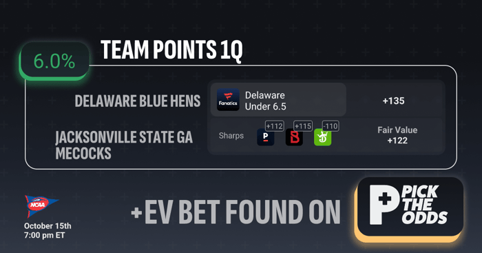 This Delaware Blue Hens 1st Quarter Under 6.5 Points (+135) play is a clear +EV bet because it offers a 6.0% expected value edge, with a fair value line of +122 across sharper books. That means the available +135 price provides better odds than what the true probability suggests. Delaware has struggled to start games fast, averaging just around 6.0 points in the first quarter this season, while Jacksonville State’s defense has been strong early, holding opponents under a touchdown in the opening frame in most games. With market consensus tighter near +115, this inflated price gives bettors both statistical backing and strong closing-line value on the under.
