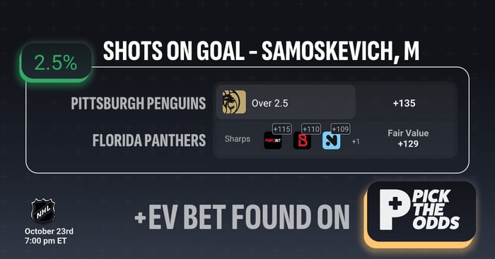 This is a +EV bet because you’re getting +135 odds on Samoskevich to record over 2.5 shots on goal, while sharp books are pricing that same prop between +109 and +115, with a calculated fair value of +129. That means the current line is mispriced, giving you roughly 2.5% expected value. Essentially, you’re betting at better odds than the market consensus—taking advantage of softer pricing compared to sharp books. When the true probability implied by the sharper lines is higher than what your book offers, that edge compounds over time and makes this a profitable play in the long run.