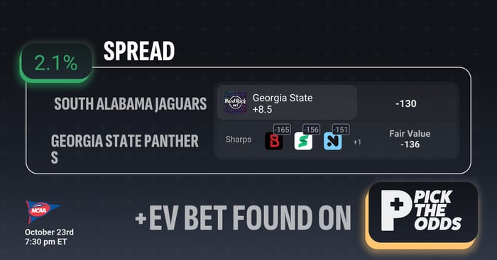 This wager holds positive expected value because Hard Rock is offering Georgia State +8.5 at -130, while sharp books have the same number juiced significantly higher, between -151 and -165, with a fair value around -136. That pricing gap indicates the market believes Georgia State covering this spread is more likely than the offered odds suggest. Essentially, you’re locking in a discounted line compared to sharper markets that have already adjusted, giving you a 2.1% edge. Finding these discrepancies before the broader market corrects them is what creates consistent betting value over time.
