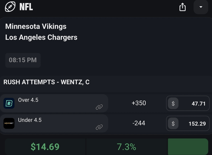 Let's say you take Wentz Under 4.5 Rush Attempts on WynnBet at -244 odds for $47.71 If this side hits you win $214.
