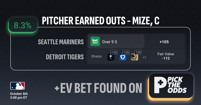 This play on Casey Mize Over 9.5 pitching outs is a strong +EV bet due to the value gap between the offered line and market consensus. While Bet365 lists the Over at +105, sharper books have it heavily juiced toward the Over (around -136), suggesting a fair value closer to -112. That pricing edge alone creates an estimated 8.3% expected value. From a performance standpoint, Mize has consistently worked past 9 outs in recent outings, averaging over 15 outs per start when healthy. Combine the performance with the great odds we're getting this makes for a great +EV bet.