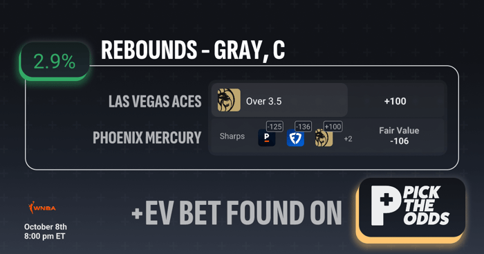 This Over 3.5 rebounds line for Chelsea Gray offers solid positive expected value based on both market pricing and performance trends. While BetMGM lists the Over at +100, sharper books are heavily leaning toward the Over, pricing it around -125 to -136, implying a fair value closer to -106. That discrepancy creates a 2.9% edge for bettors. With her current form, matchup advantage, and a favorable price compared to market consensus, this line provides both statistical and value-based backing for the Over.