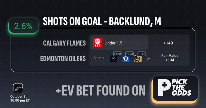 This Under 1.5 SOG on Mikael Backlund stacks up as a value play for two reasons: the market price and the player profile. The ticket is being offered around +140 while sharper books are pricing the market closer to roughly +108–+120, implying a fair price near +134 — that gap translates into the ~2.6% edge shown on the board.