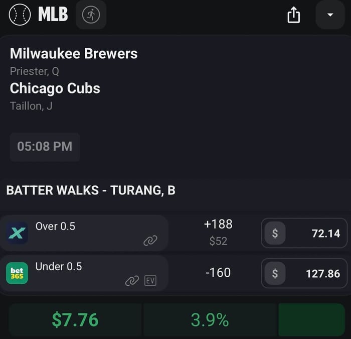 Let's say you take the Over 0.5 Walks on ProphetX at +188 odds for $72.14 If this side hits you win $207.