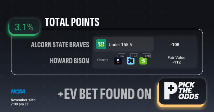 This +EV play on Alcorn State vs. Howard (Under 155.5 at -105 on Bet365) stands out thanks to clear market inefficiency. The fair value sits at -112, meaning the true odds imply a stronger likelihood of the under hitting than Bet365’s current price reflects. Sharp books have already adjusted—posting odds between -137 and -120—which indicates professional action is leaning heavily toward the under. That creates a 3.1% expected value (EV) edge, signaling that over the long run, this wager offers positive profitability. Simply put, you’re getting a discounted line versus where the sharpest books in the market have already moved.