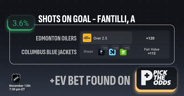This Adam Fantilli Over 2.5 Shots on Goal (+120 on BetRivers) line presents a clear +EV opportunity of 3.6%, supported by strong market discrepancies. The fair value sits at +112, implying this line should be priced shorter, and sharp books are already reflecting that—sitting between -103 and -105. That difference signals that sharp money expects Fantilli to generate enough volume to clear this mark more often than the current odds suggest. With sportsbooks like Pinnacle and DraftKings pricing the same prop closer to even money, BetRivers’ +120 offers a rare value edge. When you combine that with Fantilli’s recent shot consistency, the math supports this as a profitable long-term wager.