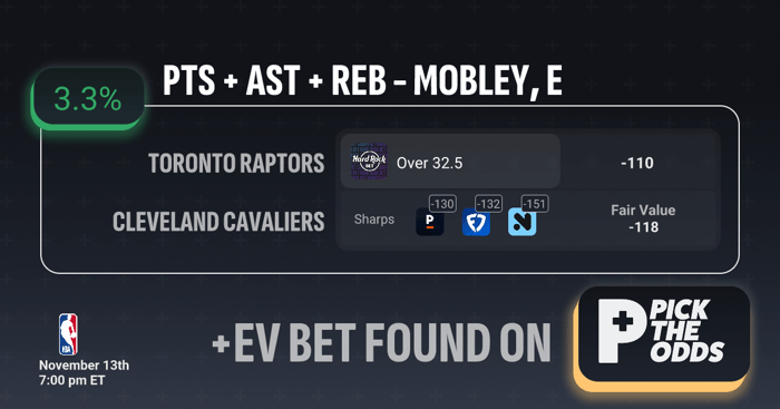 This Evan Mobley Over 32.5 PRA (-110 on Hard Rock Bet) stands out as a strong +EV play with a 3.3% edge, backed by clear market inefficiency. The fair value is set at -118, meaning the current line undervalues Mobley’s true probability of going over. Sharp books like Pinnacle, FanDuel, and NoVig are already much more aggressive—pricing the same prop between -130 and -151—indicating that professional money is heavily backing the over. With Mobley coming off two consecutive games clearing this number and facing a Raptors team that ranks among the league’s worst in defending opposing bigs, the underlying metrics and market movement both support this as a profitable +EV opportunity.