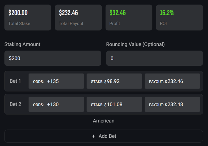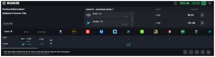 Let's say you take Kaufman Renn Over 1.5 Assists on Hard Rock at +135 odds for $98.92. If this side hits you win $232.